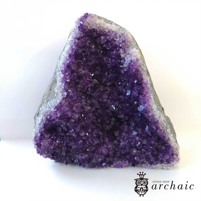 ウルグアイ産アメジスト 幅220×高さ71×奥行71mm 横幅が長ーい、先のとがった舟形のウルグアイ産のアメジストのクラスター(群晶)です。 ウルグアイ産ならではのしっかりと濃い紫色の結晶に、丸っこいフラワーアメジストが飛び出すようにくっついています。 かなりずっしりと重いので取り扱いには十分ご注意ください。 アメジストのクラスターでは久々の大型サイズです!
