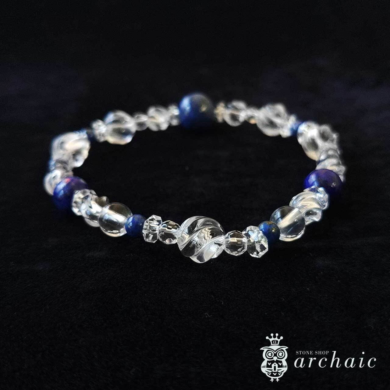古くから世界中で愛されてきた石・大粒のラピスラズリを中心に、いろんなカットの水晶、その合間にまたサイズの違うラピスを入れたブレスレットです。