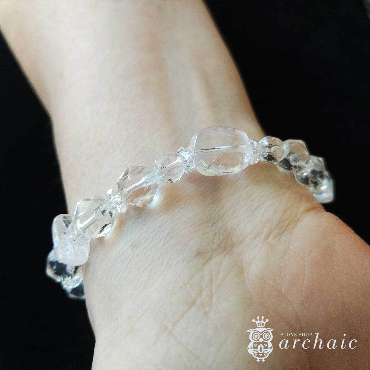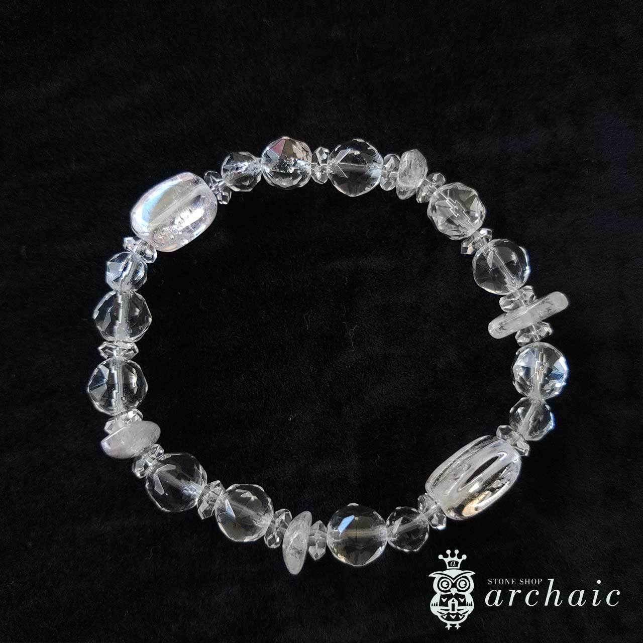 ほんのりとピンク色を帯びた透明に近いクンツァイトと、いろいろなカットの水晶をつないだブレスレットです。