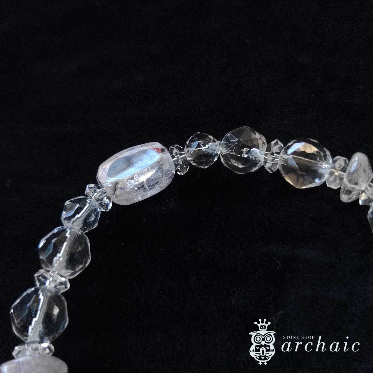 クンツァイトには癒しや無償の愛などの意味があり、持つ人に安らぎを与えてくれるとされています。万能の水晶と組み合わせることで、夏にぴったりの涼しげなブレスになりました。