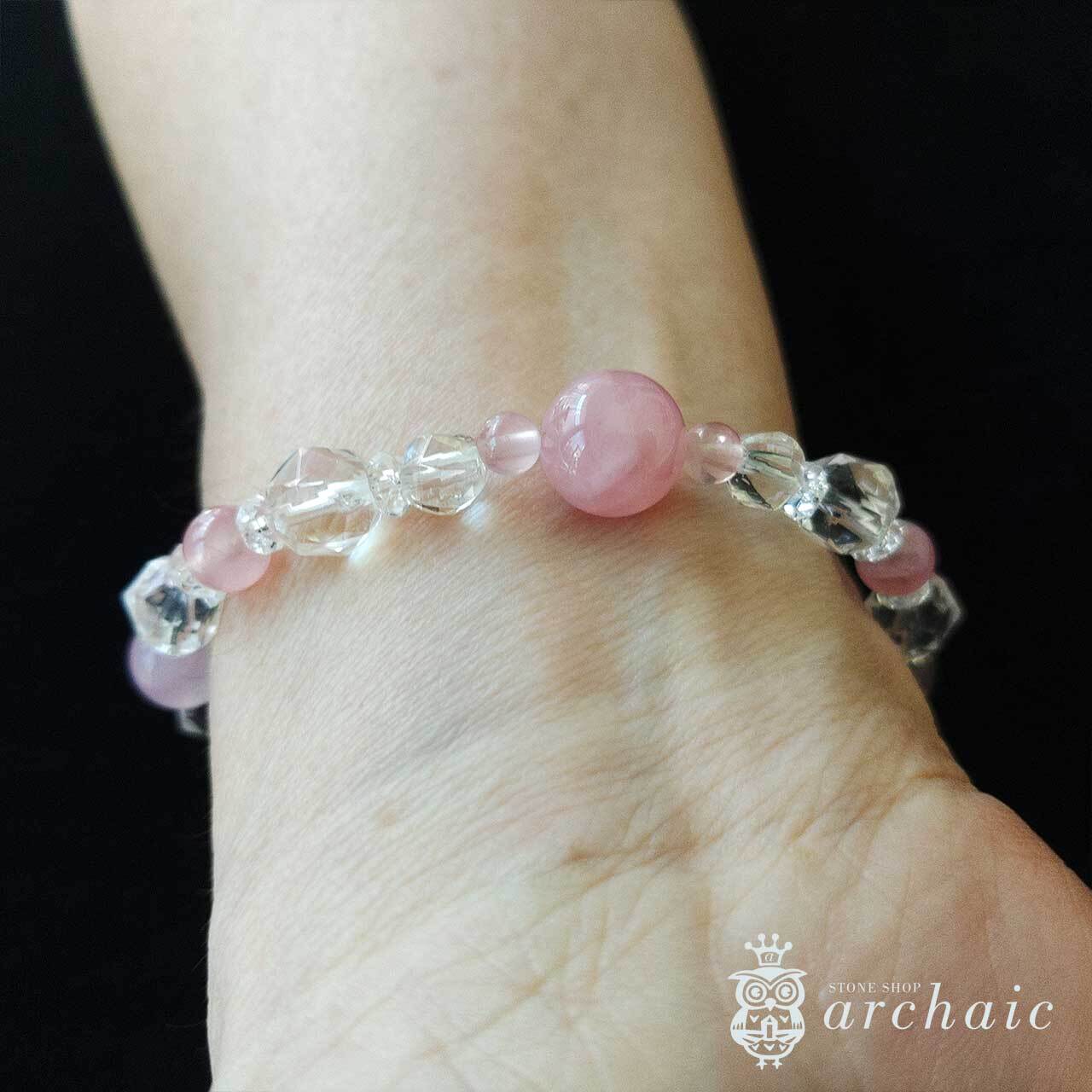 透明度が高いのに発色がよいマダガスカル産のローズクォーツと、いろいろなカットの水晶をつないだブレスレットです。