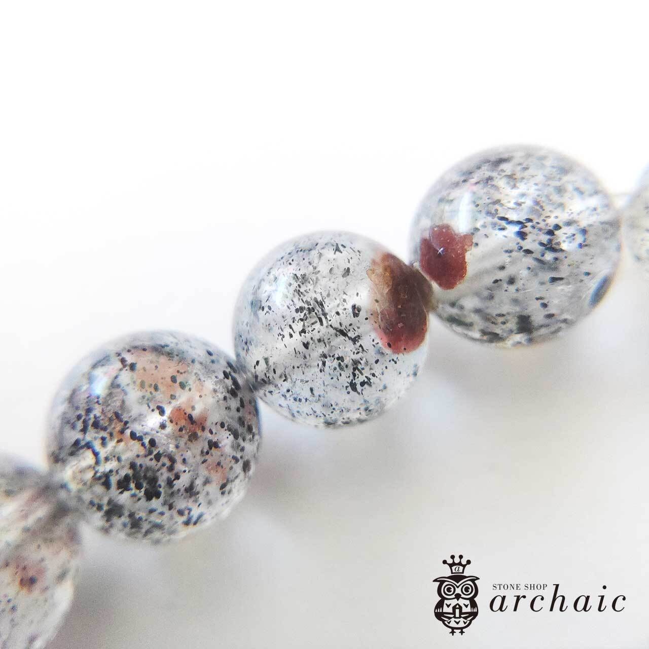 透明な水晶の中に、赤いガーネットとバイオタイト(黒雲母)が内包されたガーネット&バイオタイトインクォーツの一連ブレスレット。