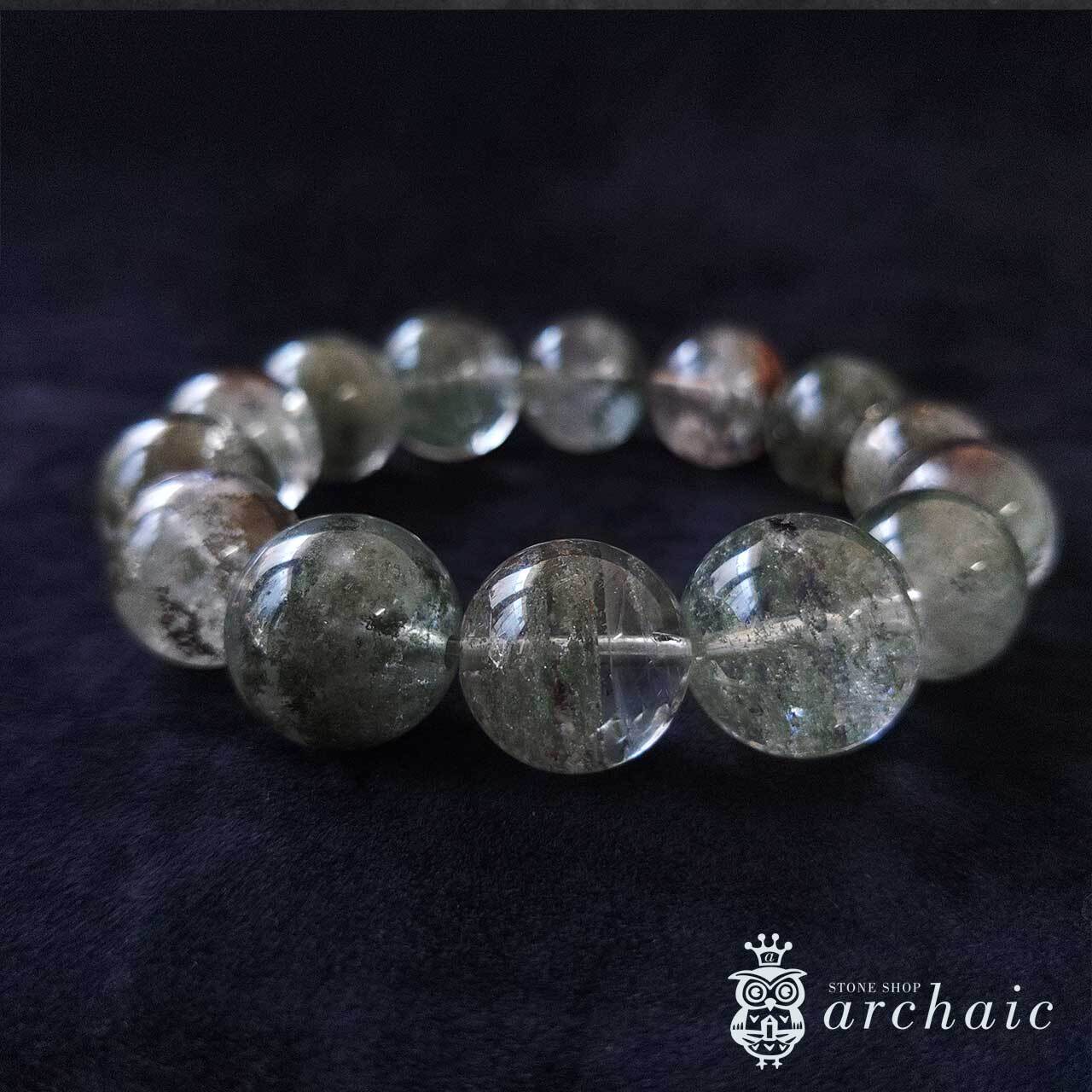 水晶に内包された濃いグリーンが庭園の様相を醸す、大粒のガーデンクォーツのブレスレットです。一粒一粒のサイズは13mm以上とかなり大きめですが、ボリュームのあるバングルのように着けて頂けるサイズ感に仕上げています。