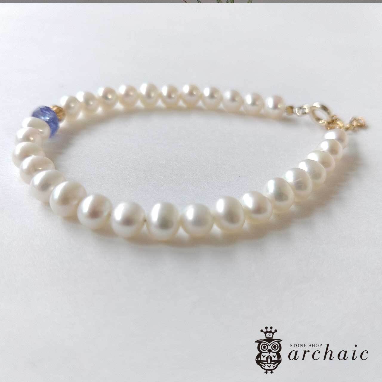 優しいホワイトの淡水パールに、大粒のタンザナイト(ボタンカット)を1粒組み合わせた、上品でクラシカルな印象のブレスレット。