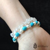 ムーンストーンと水晶を交互につないだ、白と透明がきりっと際立つシンプルなブレスレット。ムーンストーンは、全部ではありませんがブルーのシラーがあらわれるものもあります。