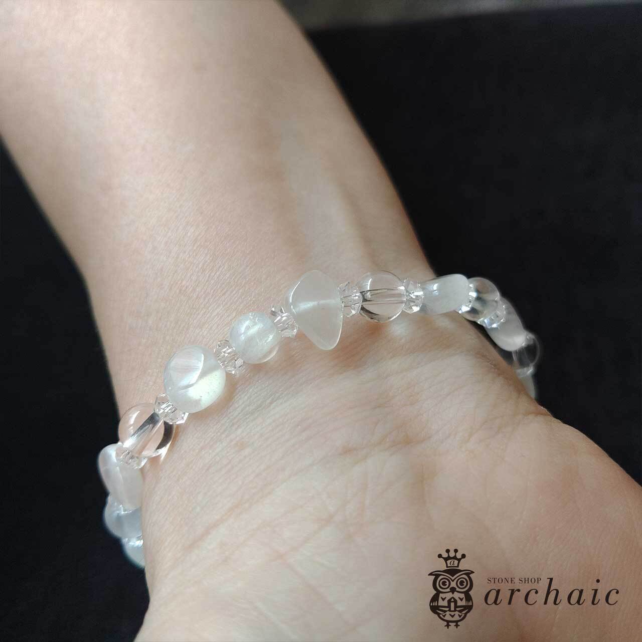 ムーンストーンと水晶を交互につないだ、白と透明がきりっと際立つシンプルなブレスレット。こちらは4粒だけ、水晶の丸玉を入れています。