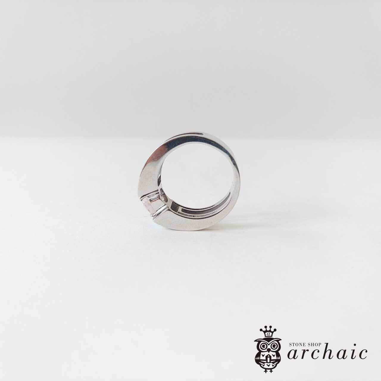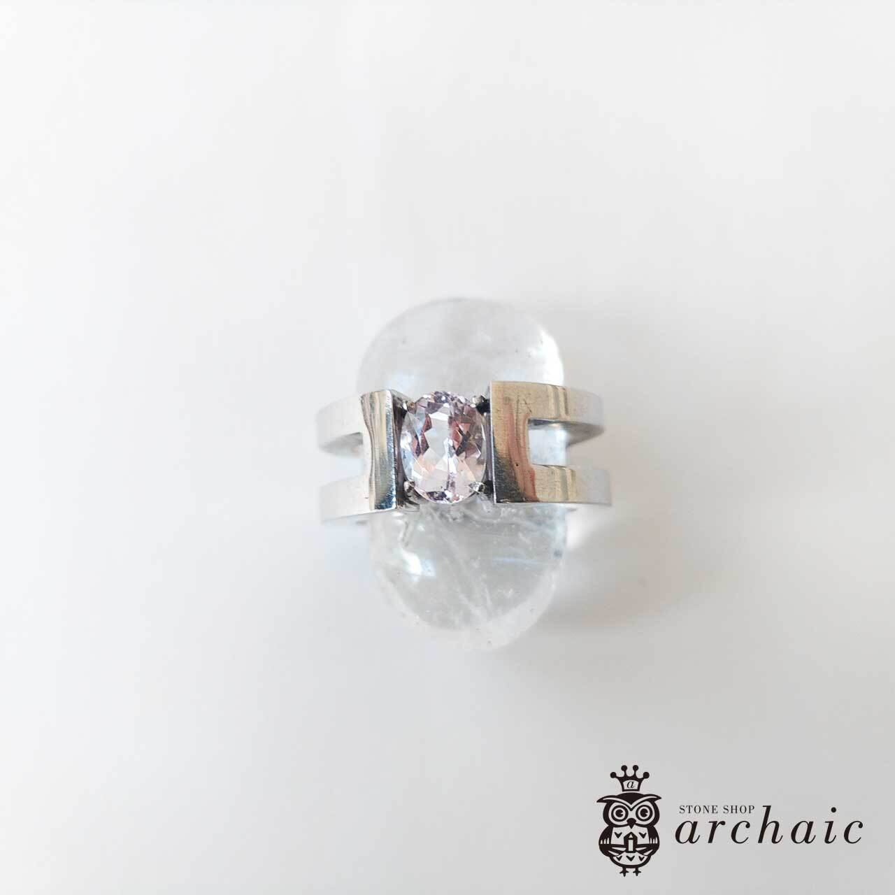 透き通った淡いピンクが美しい、宝石質の大きなピンクサファイアを中央に配した個性的なリングです。シルバーをふんだんに使っているためずっしりとボリュームがあり、リングサイズも大きくなっております。