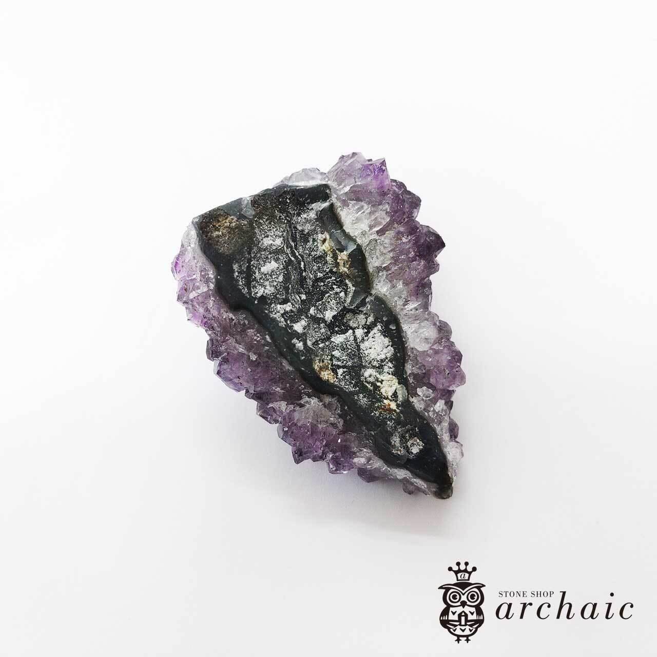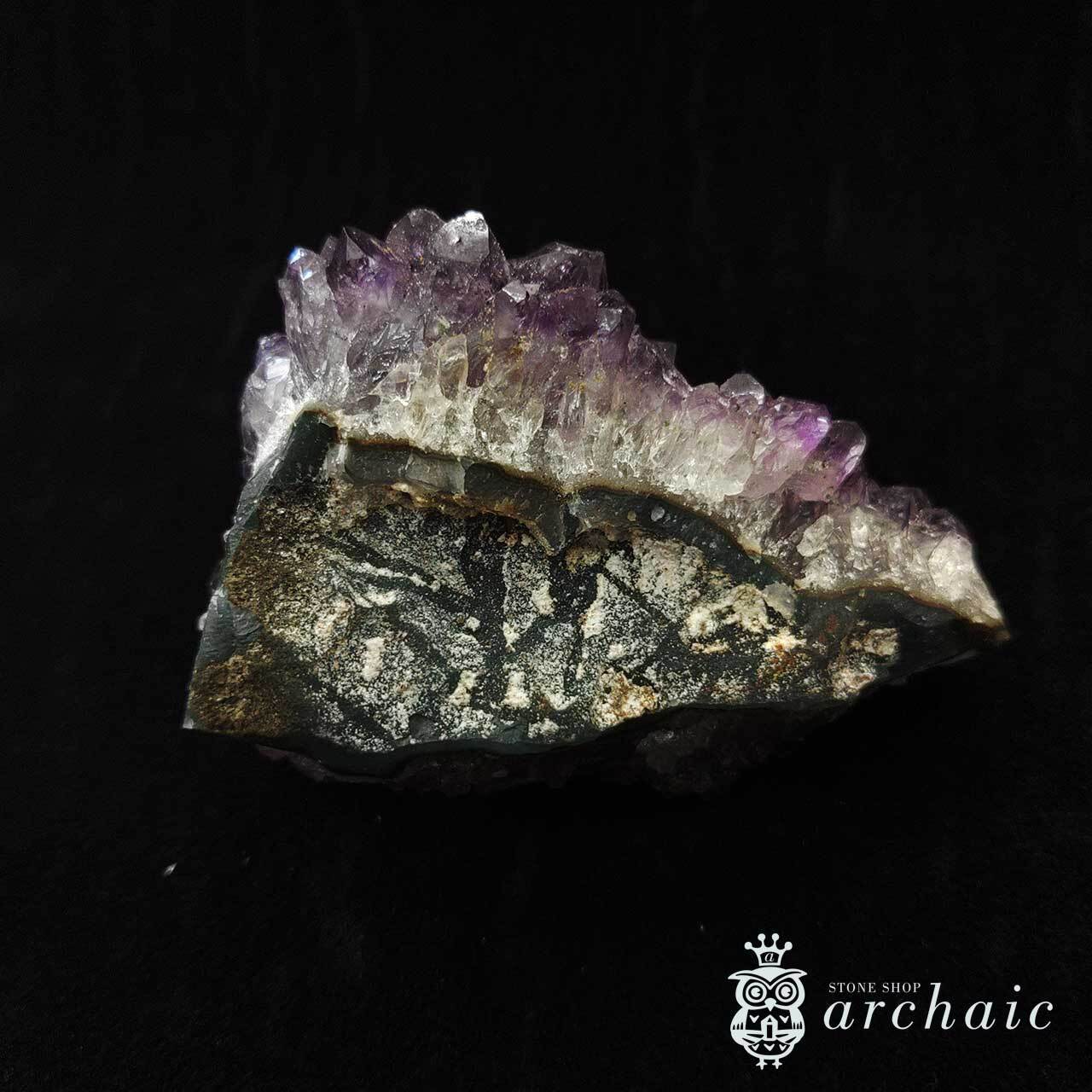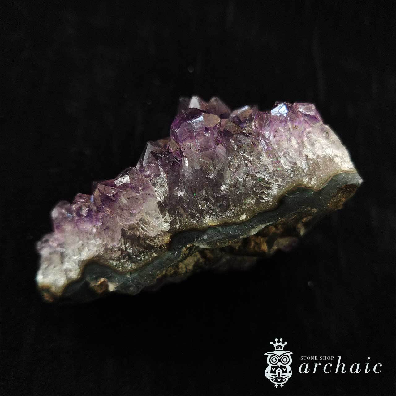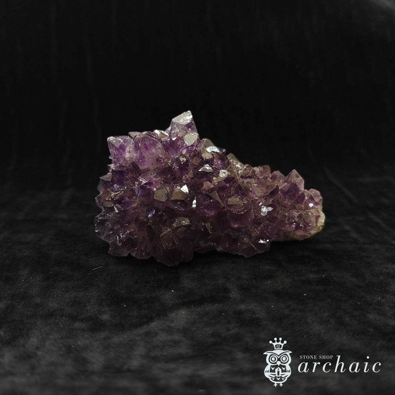 アメジストのクラスターに丸いアメジストがくっついたフラワーアメジストです。横から見るとこんもりと放射状に広がっていて、なんとも言えない愛らしさです。