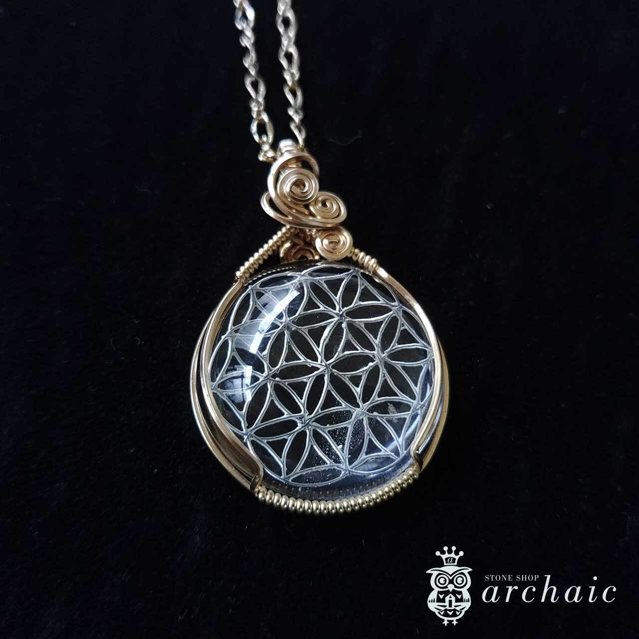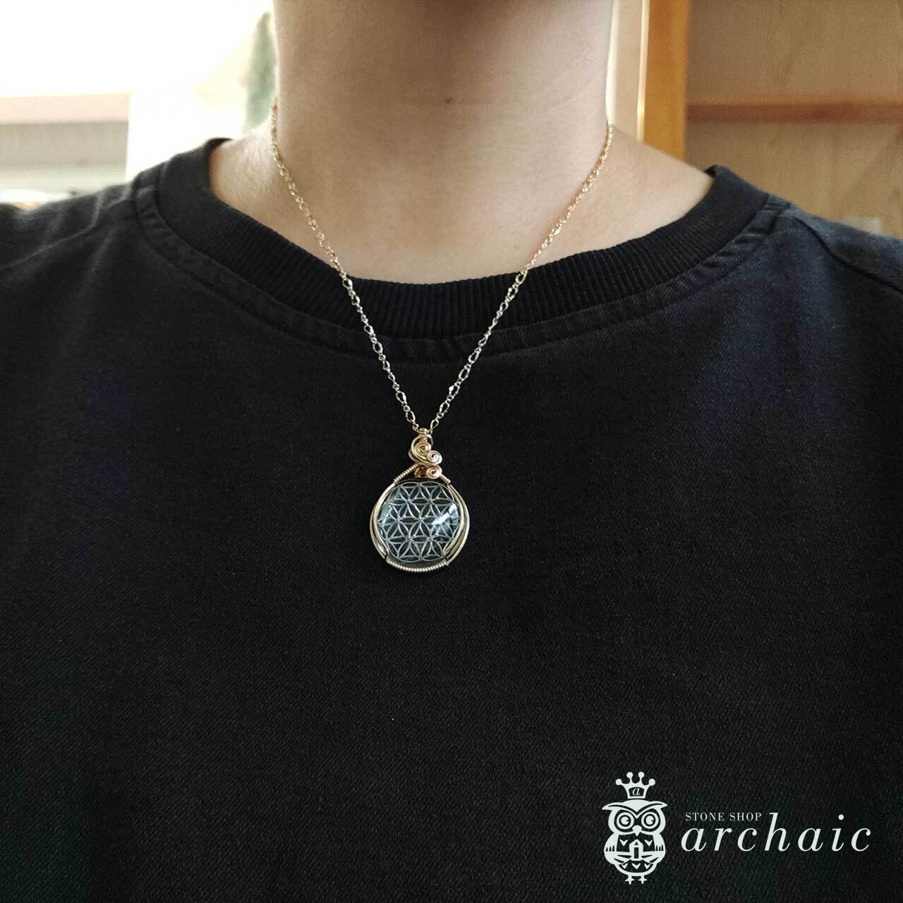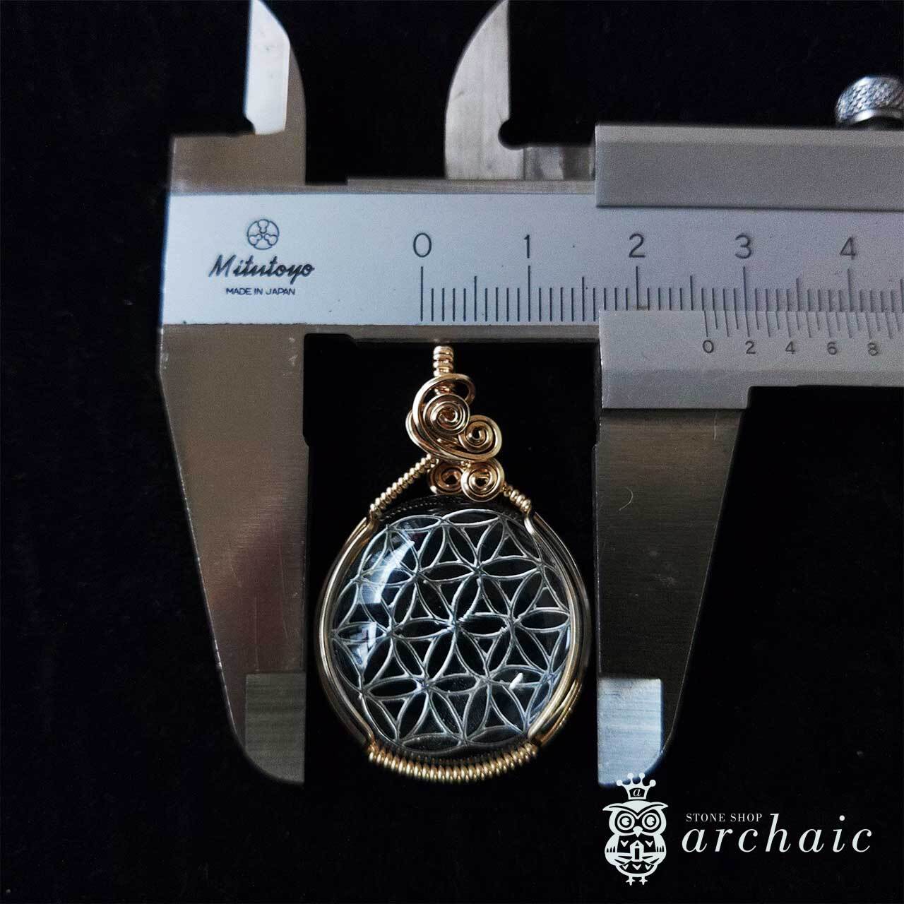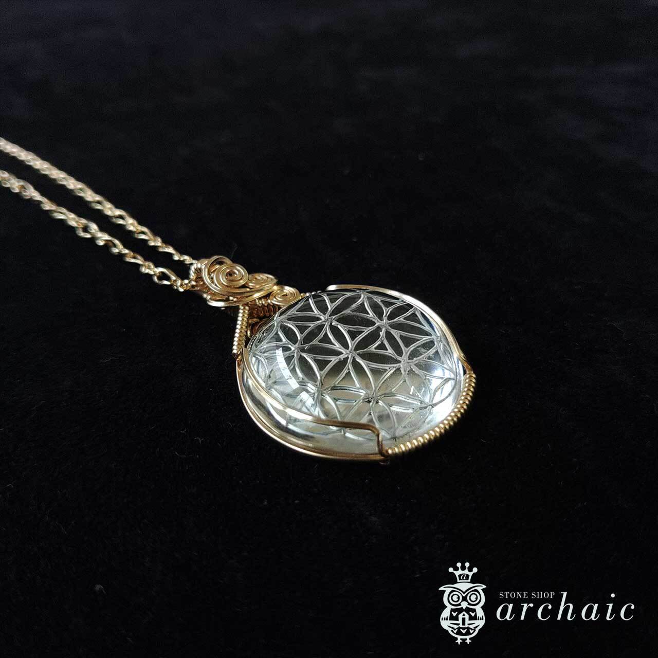 フラワーオブライフのモチーフが手彫りされた稀少なヒマラヤ水晶を、14KGFワイヤーで丁寧に巻いた、すべてが手作りのペンダントトップ。