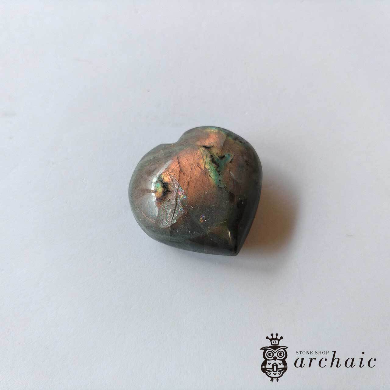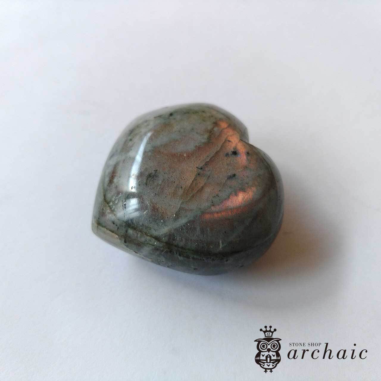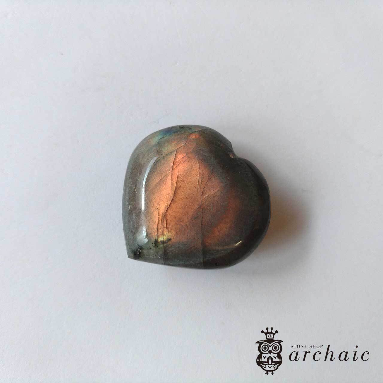 表面にオレンジ~ピンク色のラブラドレッセンスがあらわれるラブラドライトのハート形磨き原石です。角度によって表れるラブラドレッセンスは色も光り方も美しく全く同じものは一つとしてありません。特に、ピンクやオレンジカラーのラブラドレッセンスはなかなかレアです。