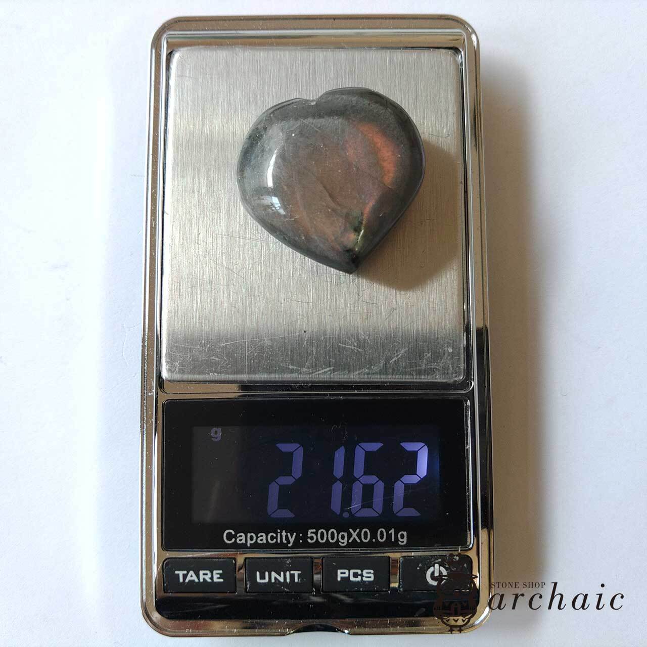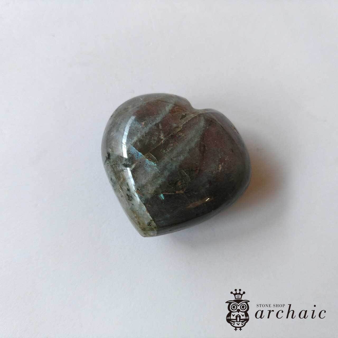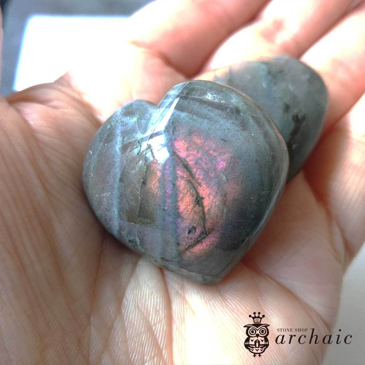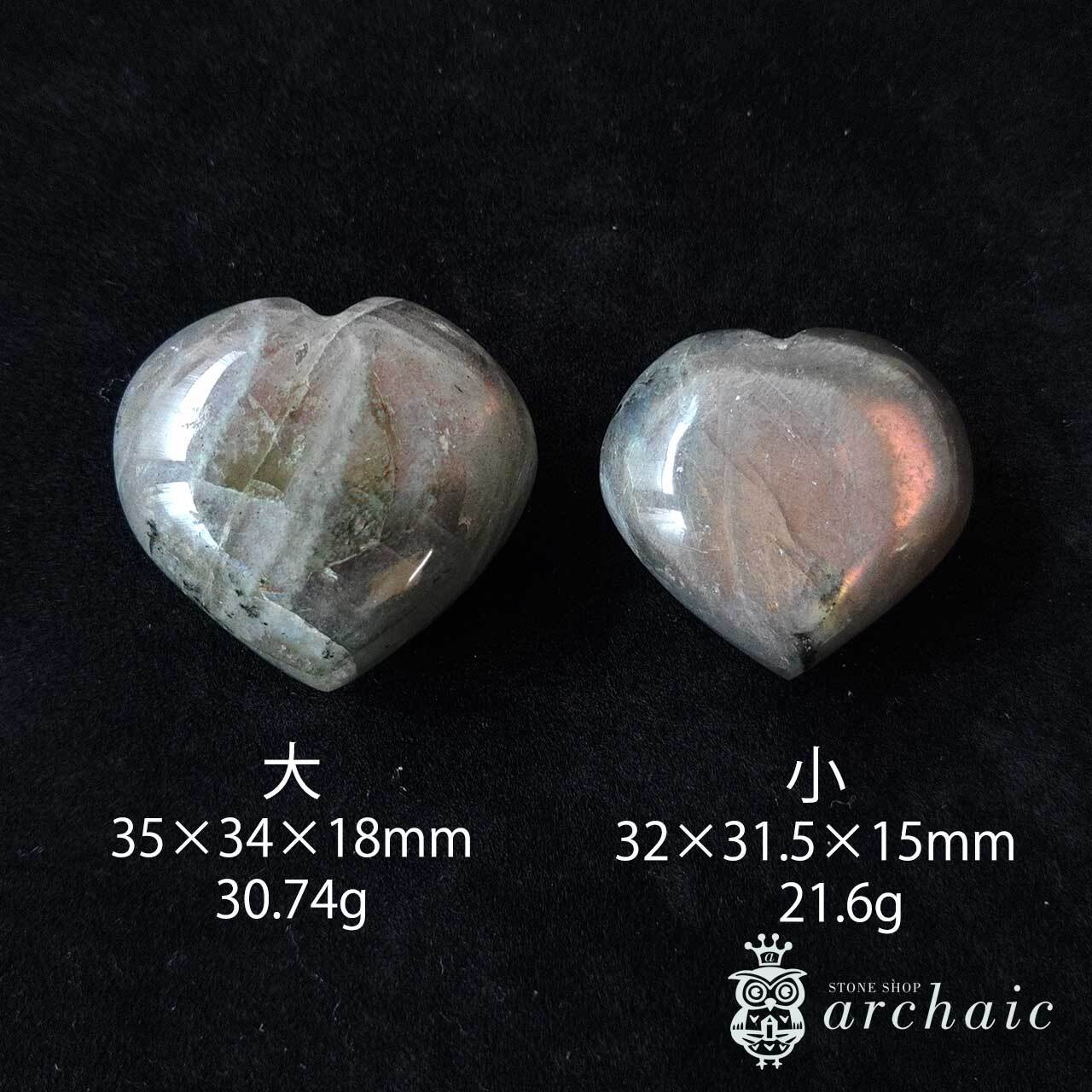 表面にオレンジ~ピンク色のラブラドレッセンスがあらわれるラブラドライトのハート形磨き原石です。角度によって表れるラブラドレッセンスは色も光り方も美しく全く同じものは一つとしてありません。特に、ピンクやオレンジカラーのラブラドレッセンスはなかなかレアです。