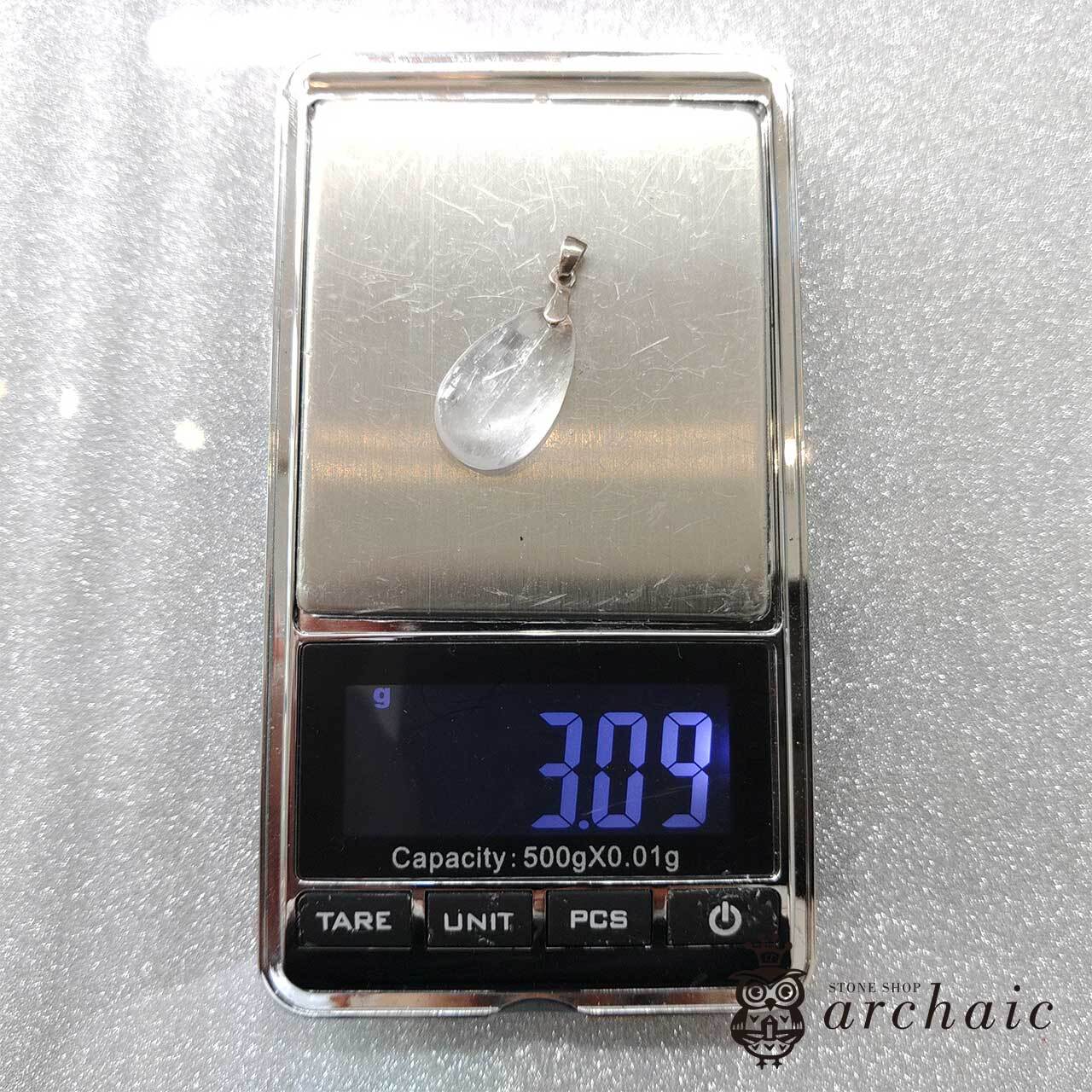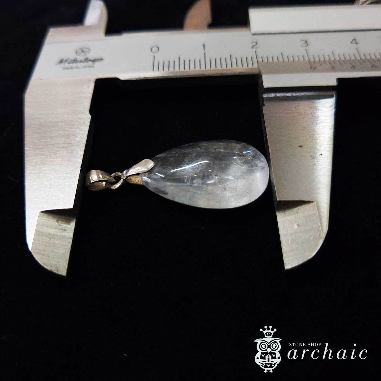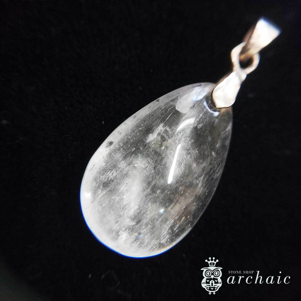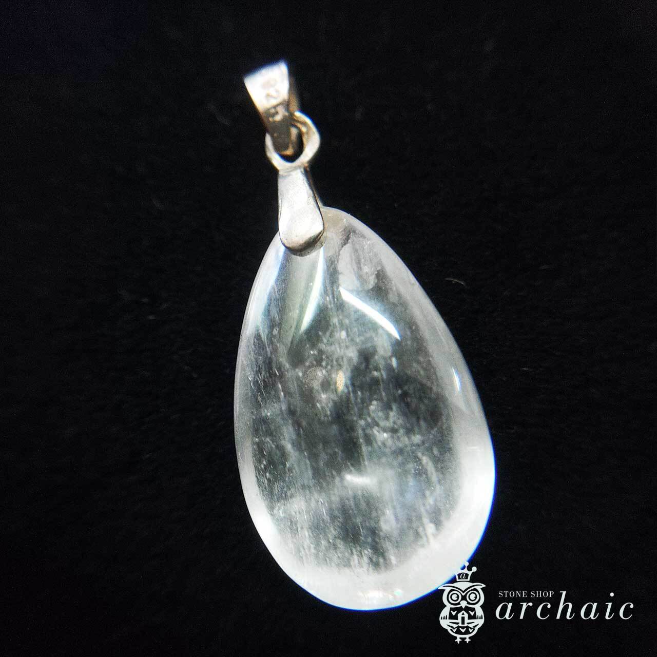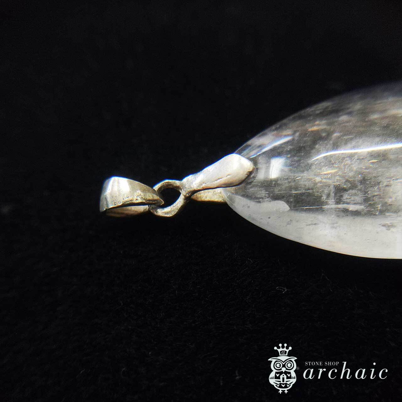 白いクンツァイトのドロップカボションにシルバーのバチカンをつけたペンダントトップです。クンツァイトはピンク色のものが多いのですが、こちらはほぼ白で、金具に使用されているシルバーはメッキ等がされていない無垢のものです。