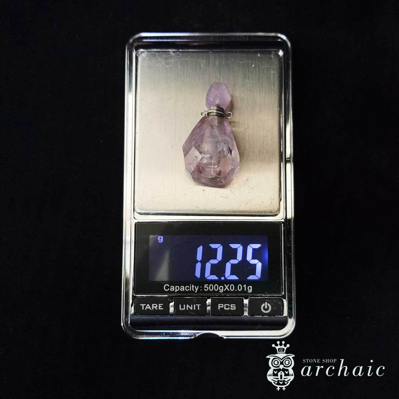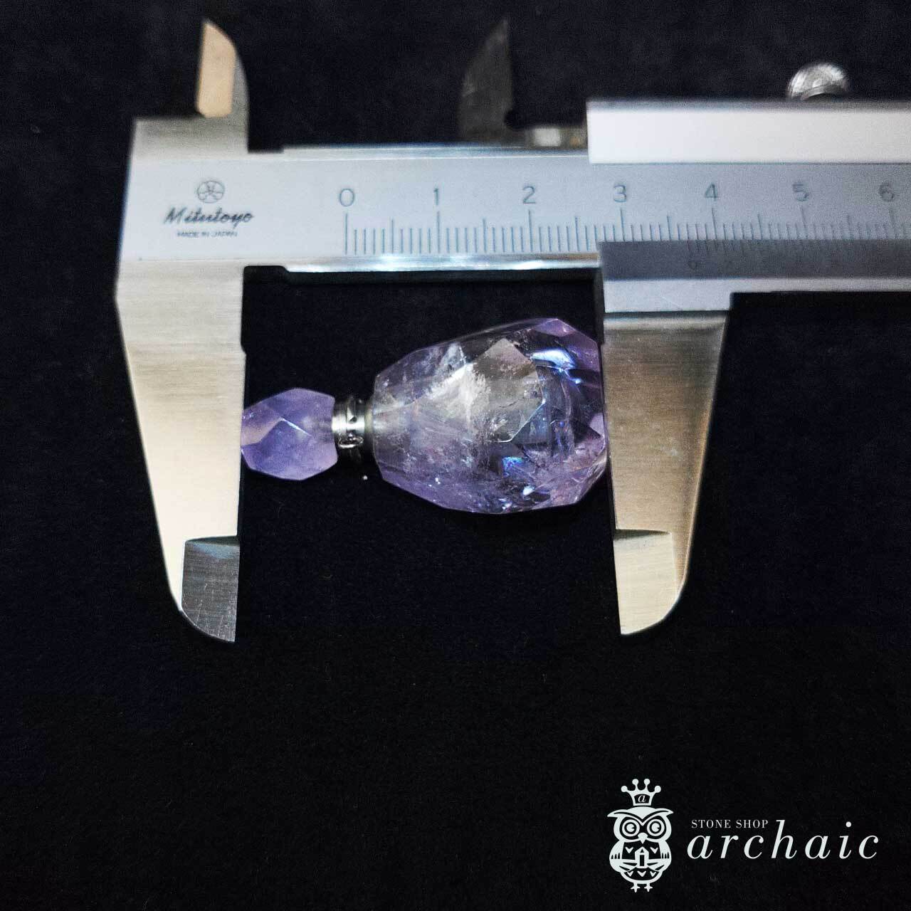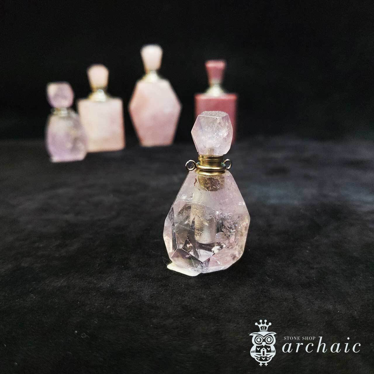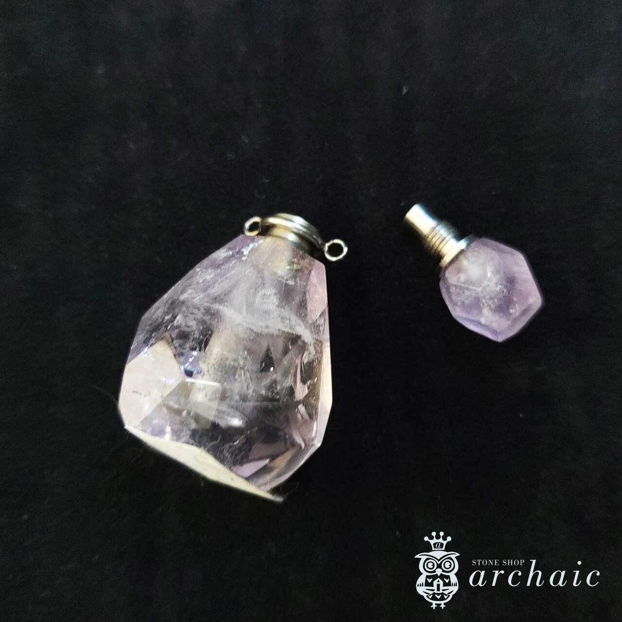 アメジストでできた、原石の風合いを残した香水ボトルです。