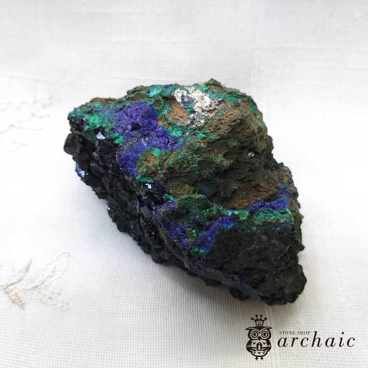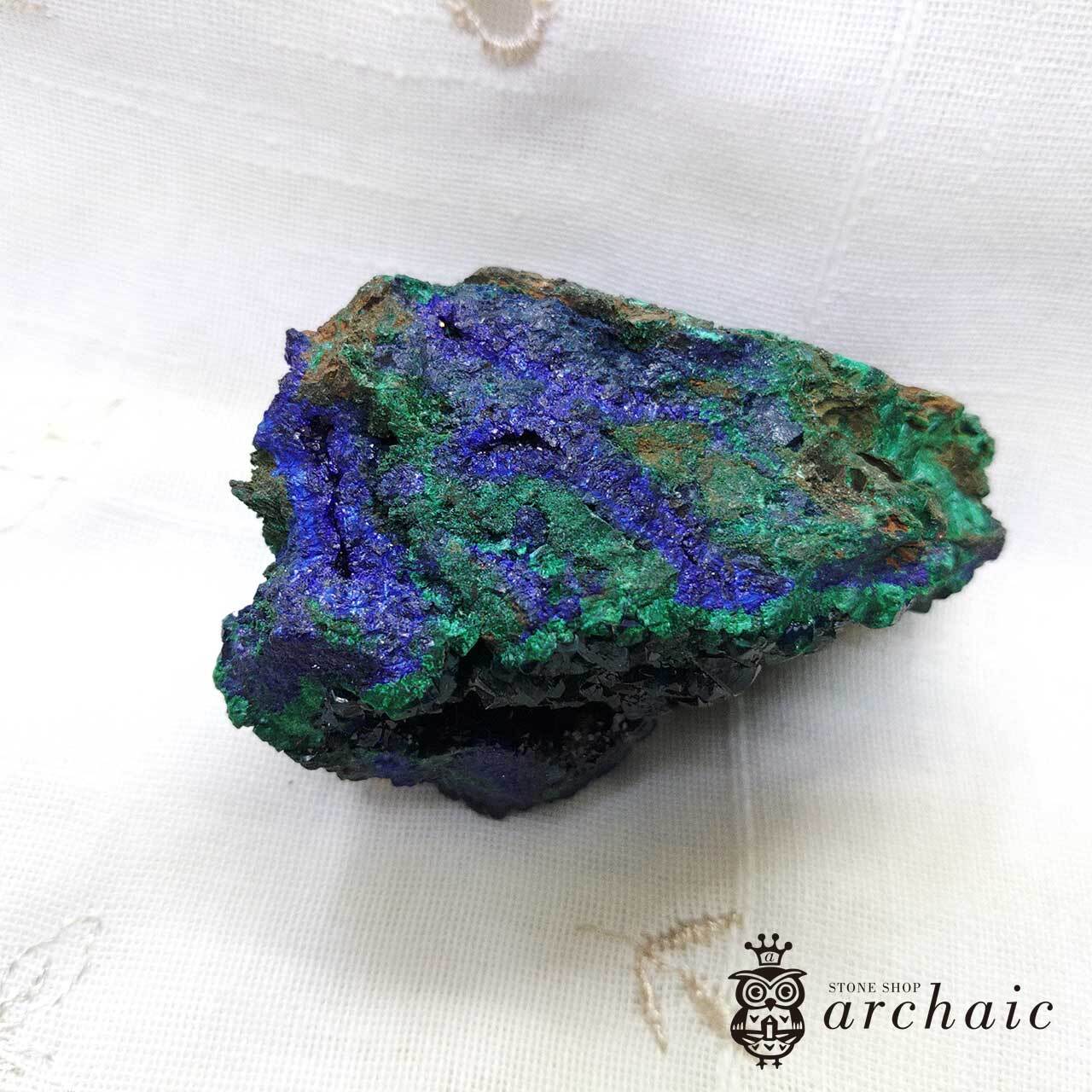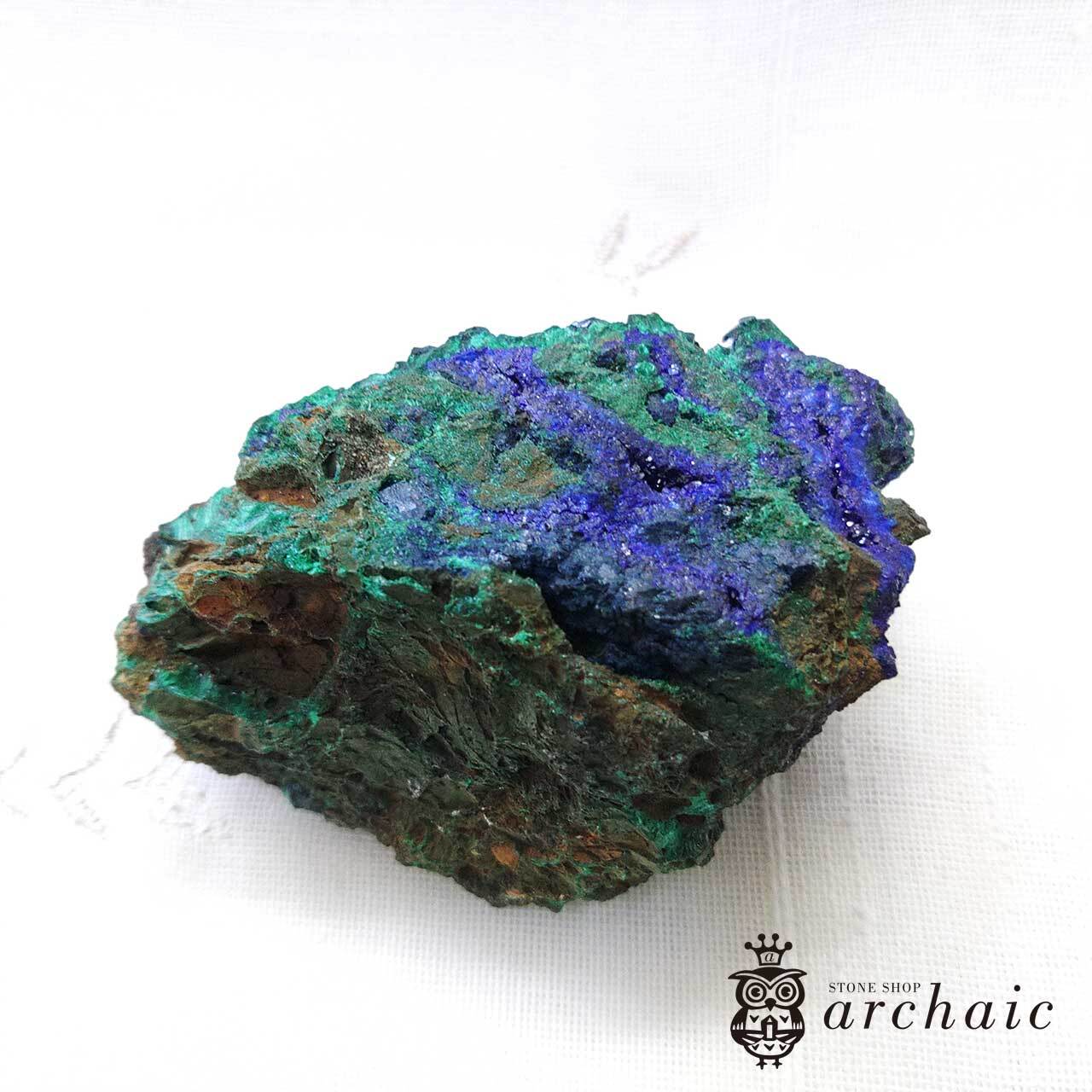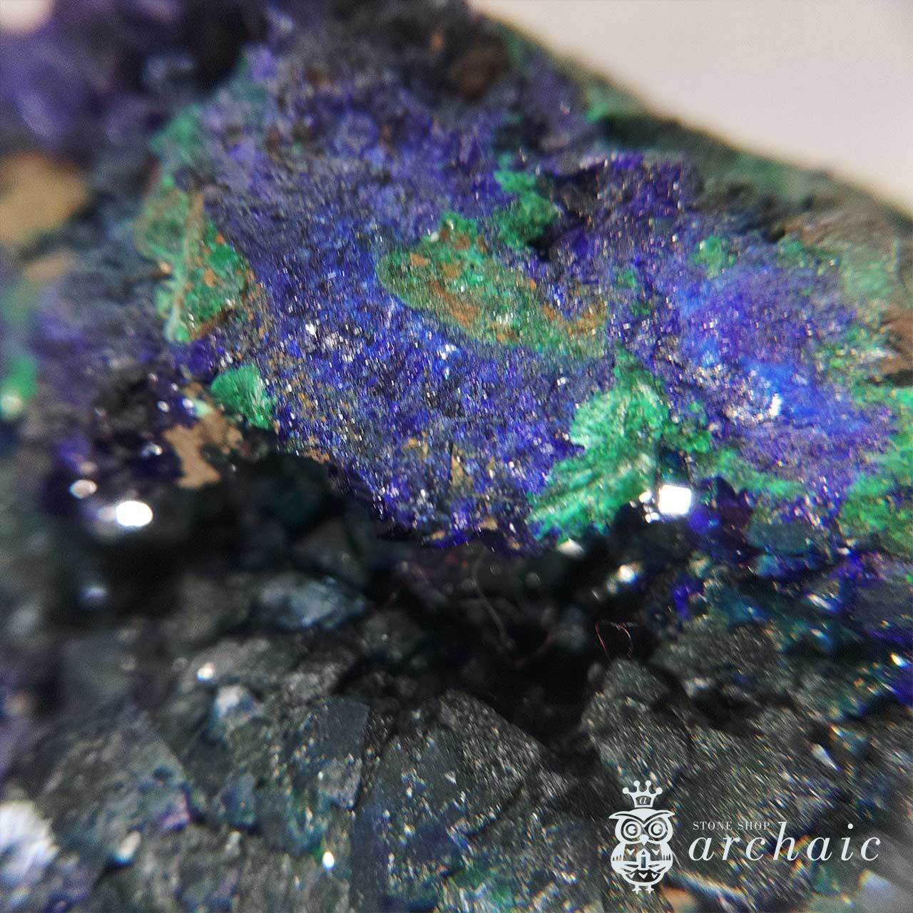 透明感はありませんが、今にも塗料が滴り落ちてきそうな、アズライトのねっとりとした質感と、茶色い母岩と混ざって乾いたようなマラカイトの質感の差がとても面白いです!