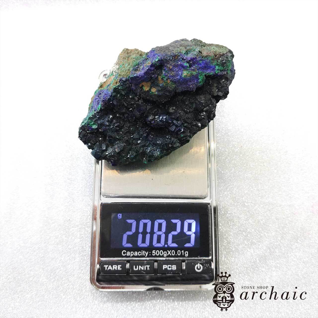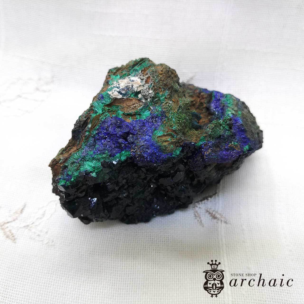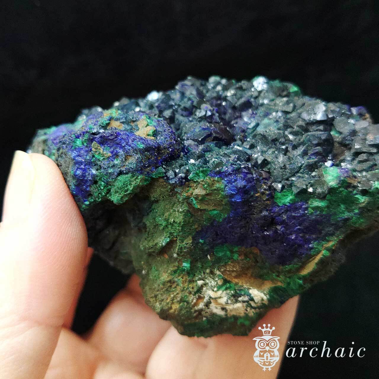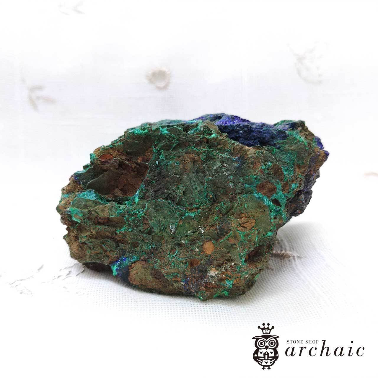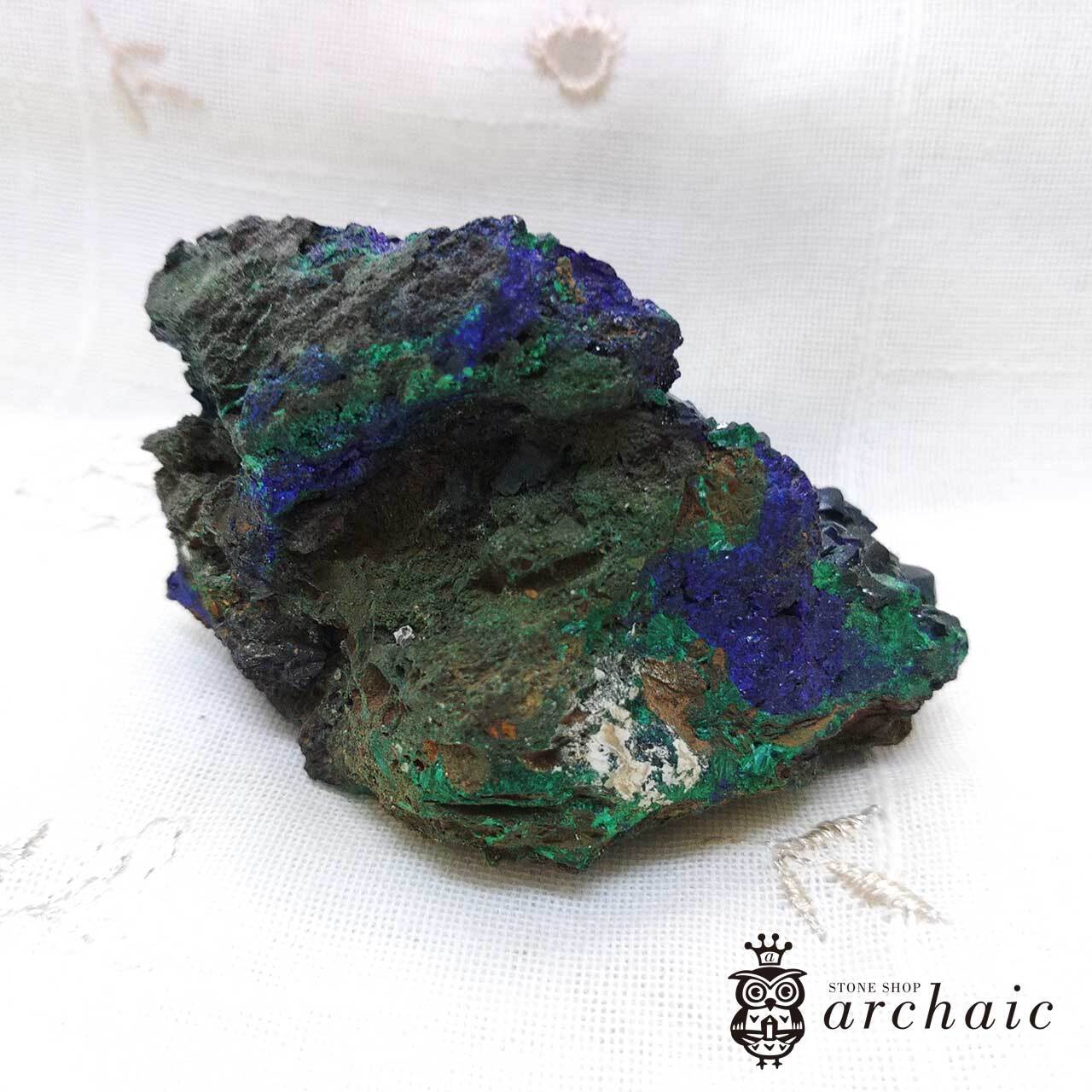 透明感はありませんが、今にも塗料が滴り落ちてきそうな、アズライトのねっとりとした質感と、茶色い母岩と混ざって乾いたようなマラカイトの質感の差がとても面白いです!