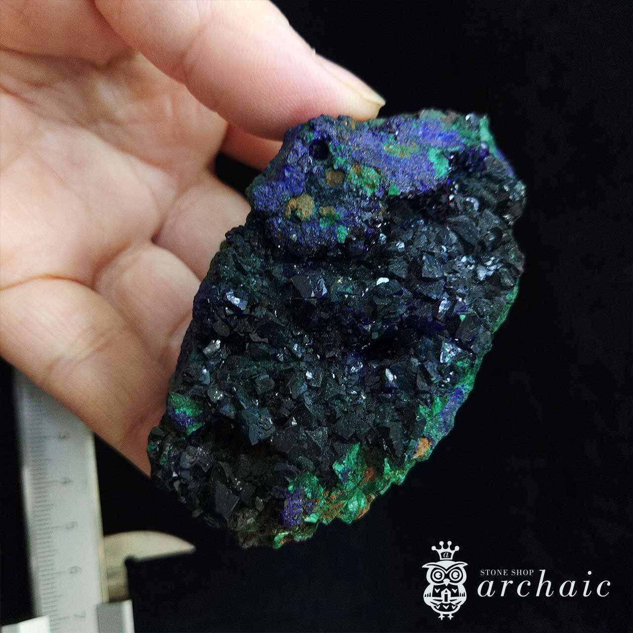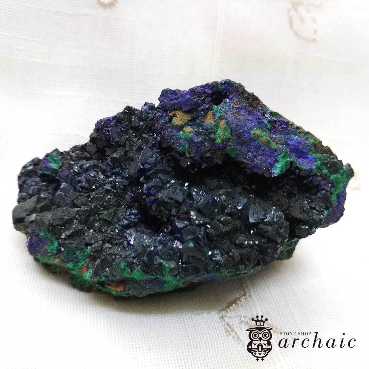 濃紺のアズライトの結晶に緑色のマラカイトが共生している、アズライトマラカイトの原石です。