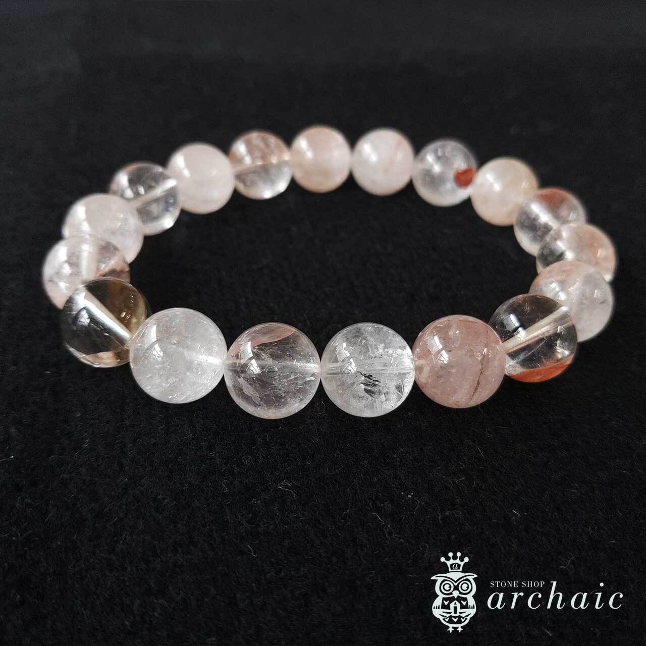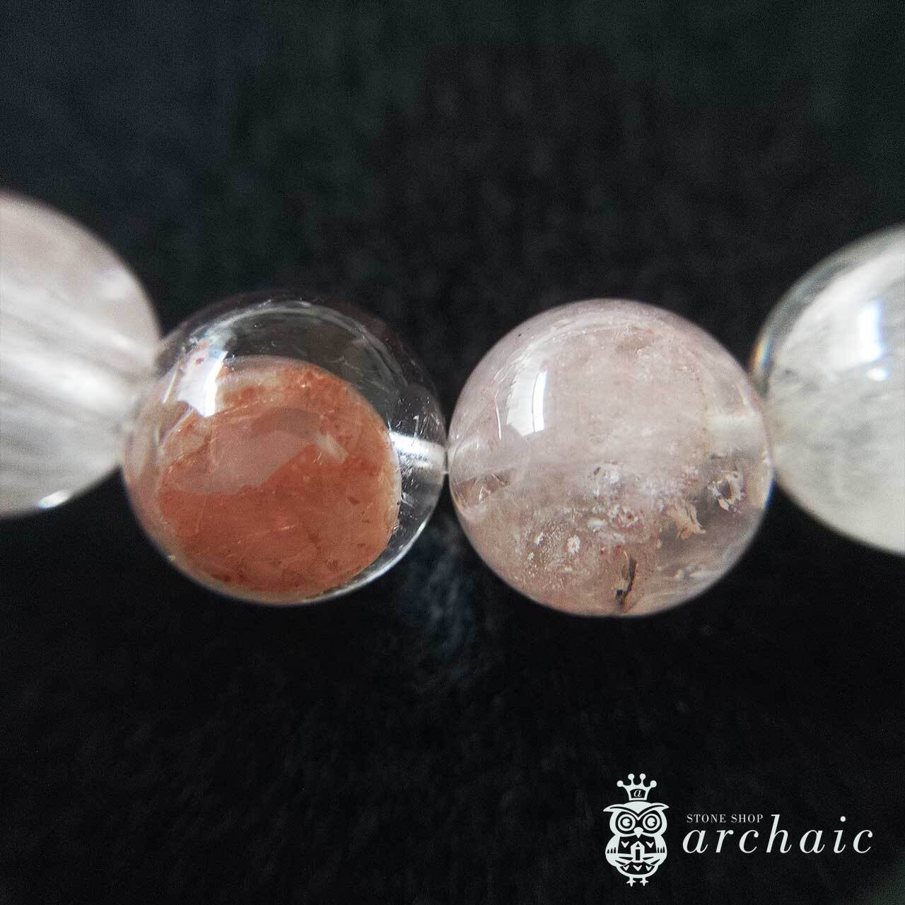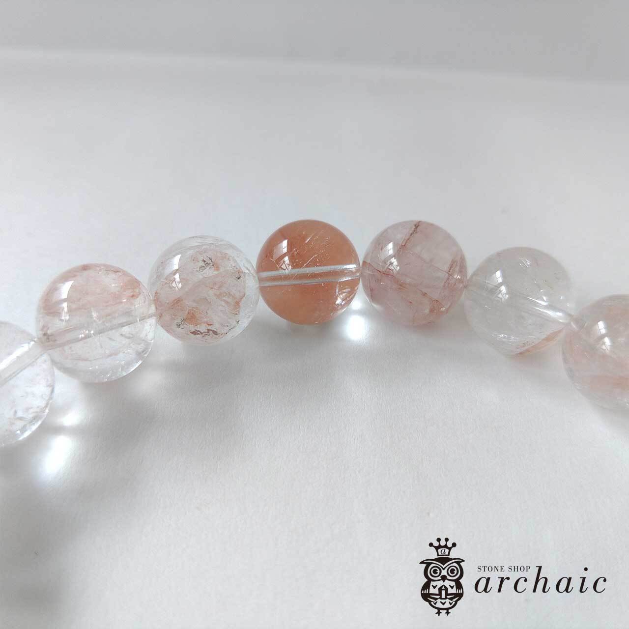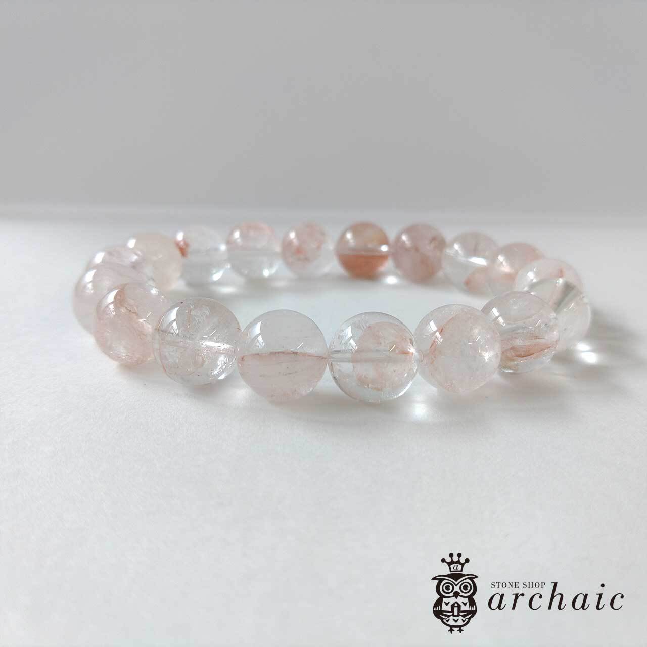 内包物やクラックなどもありますが、透明度が高くほんのりピンク色を帯びたヒマラヤ産・マニカラン水晶の一連ブレスレットです。