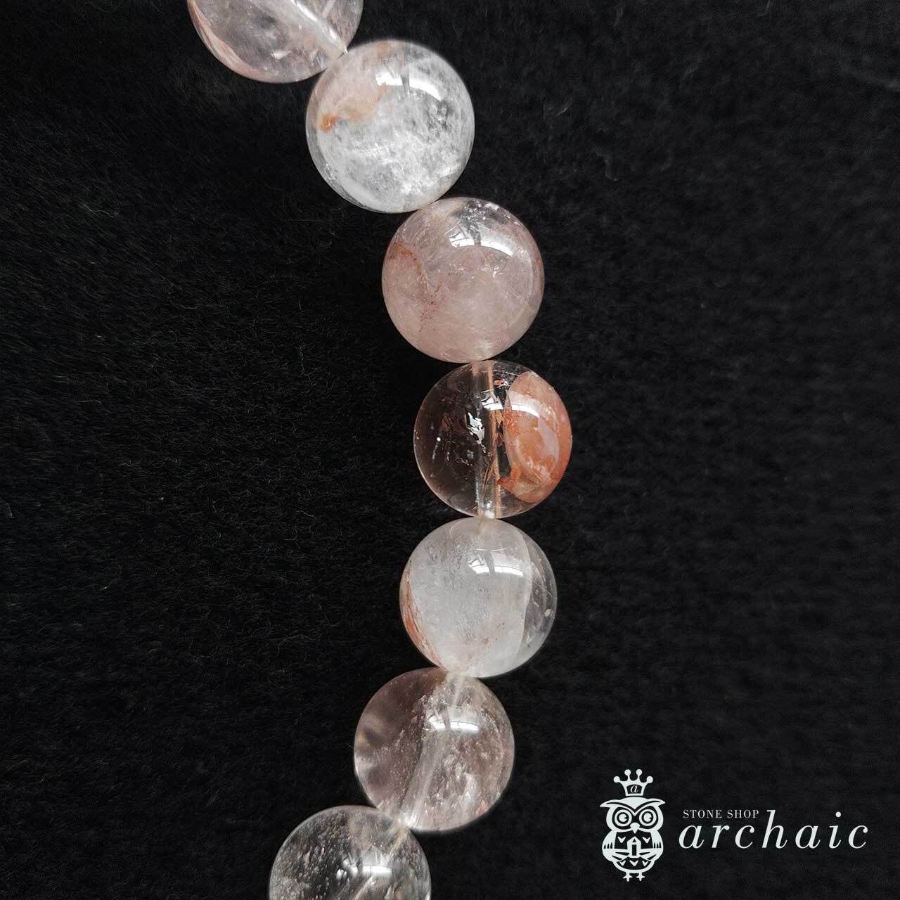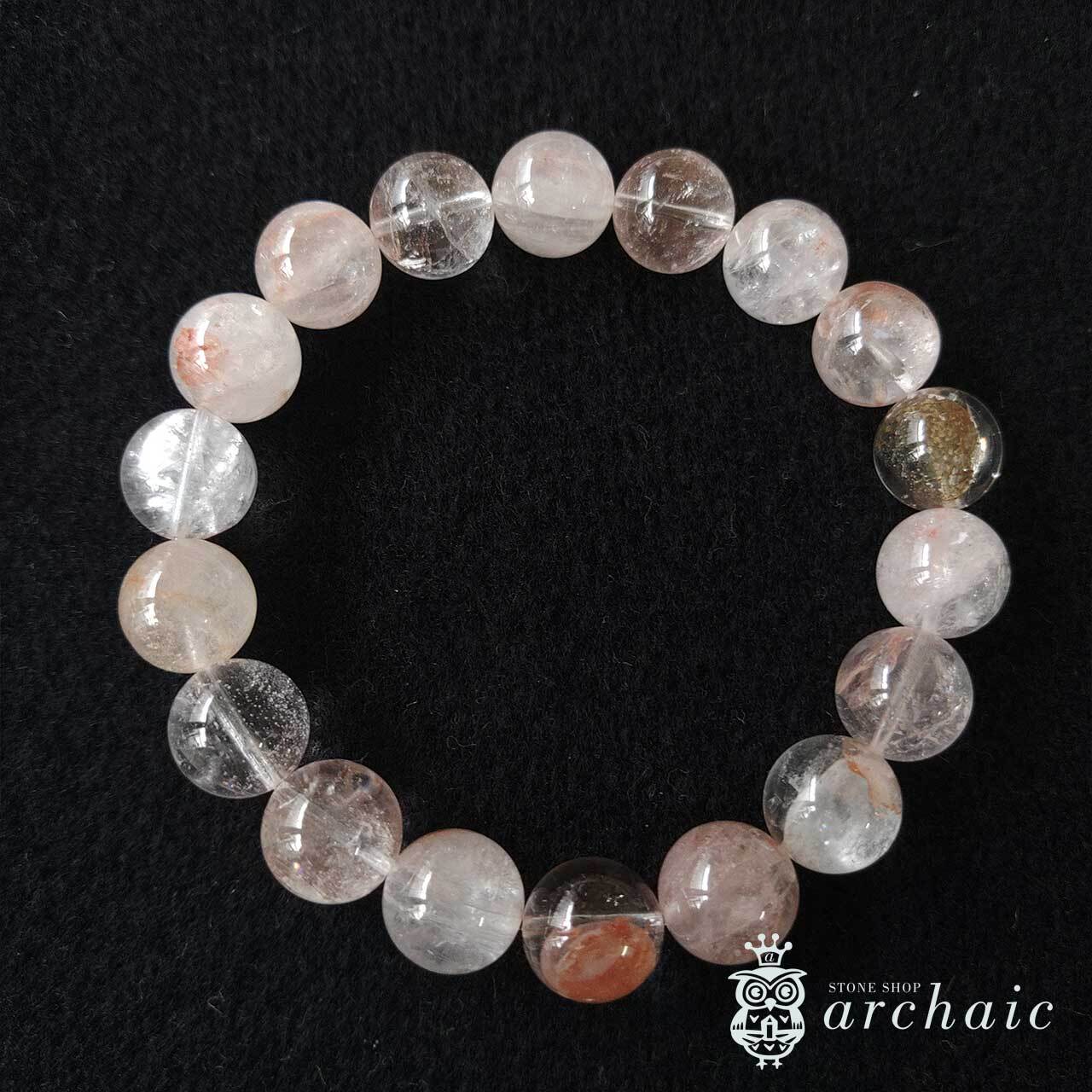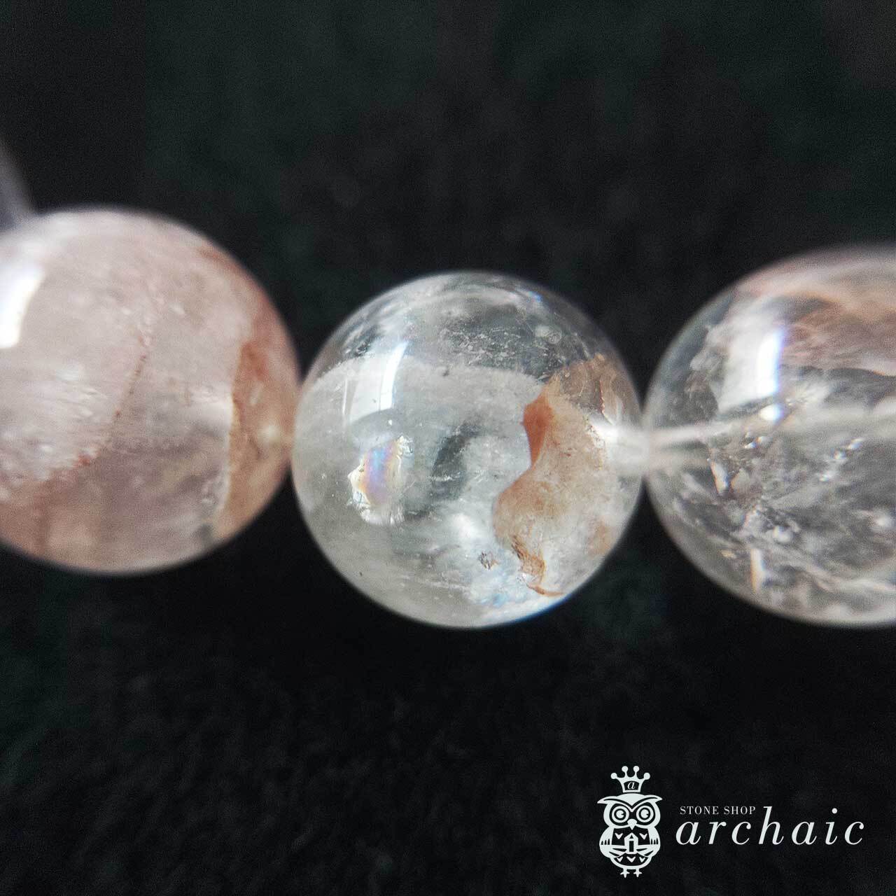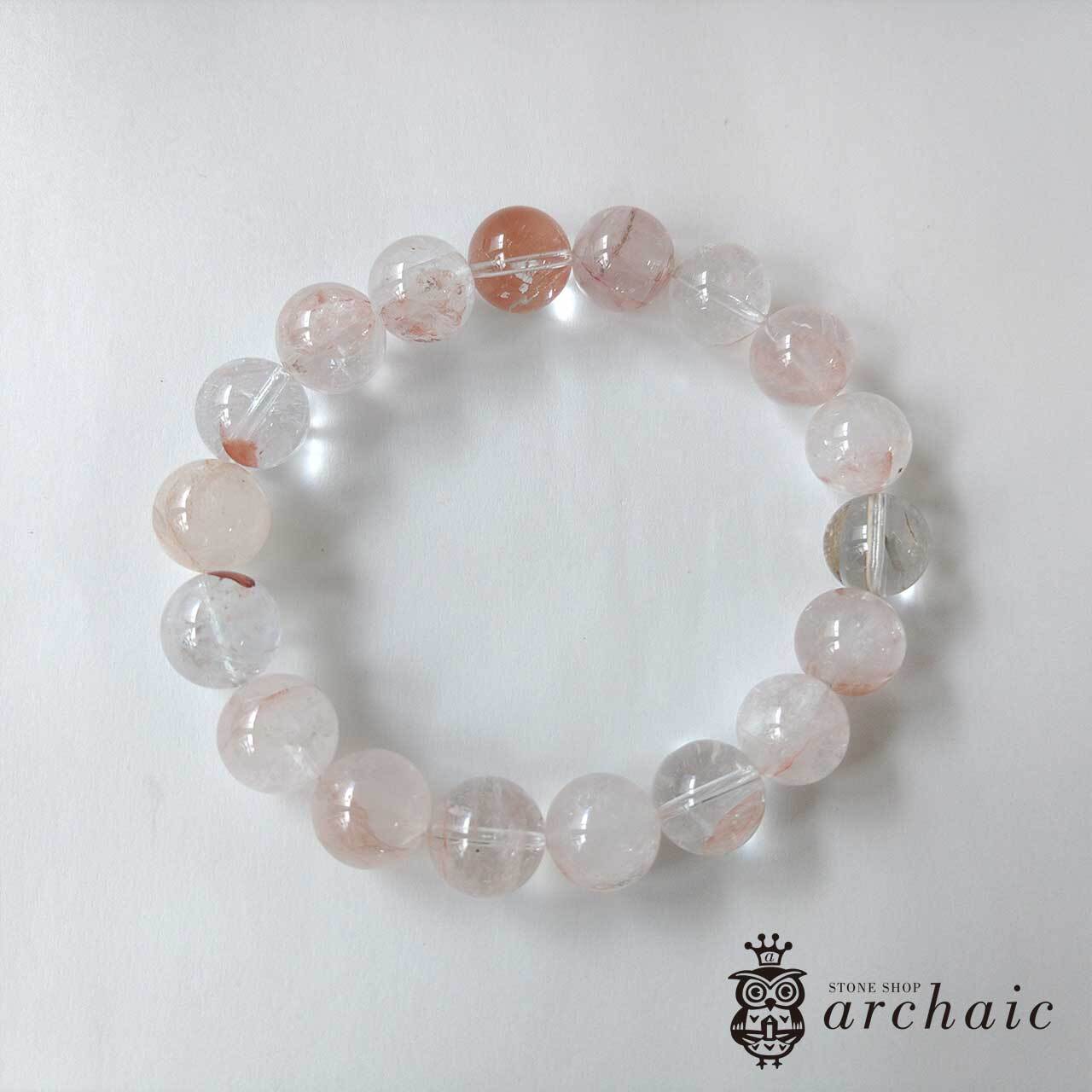 内包物やクラックなどもありますが、透明度が高くほんのりピンク色を帯びたヒマラヤ産・マニカラン水晶の一連ブレスレットです。