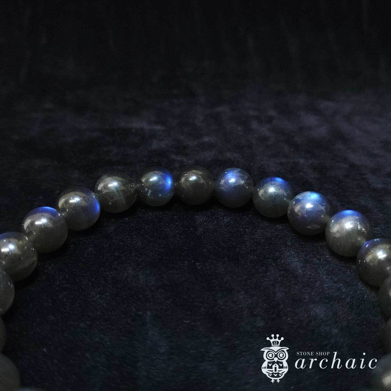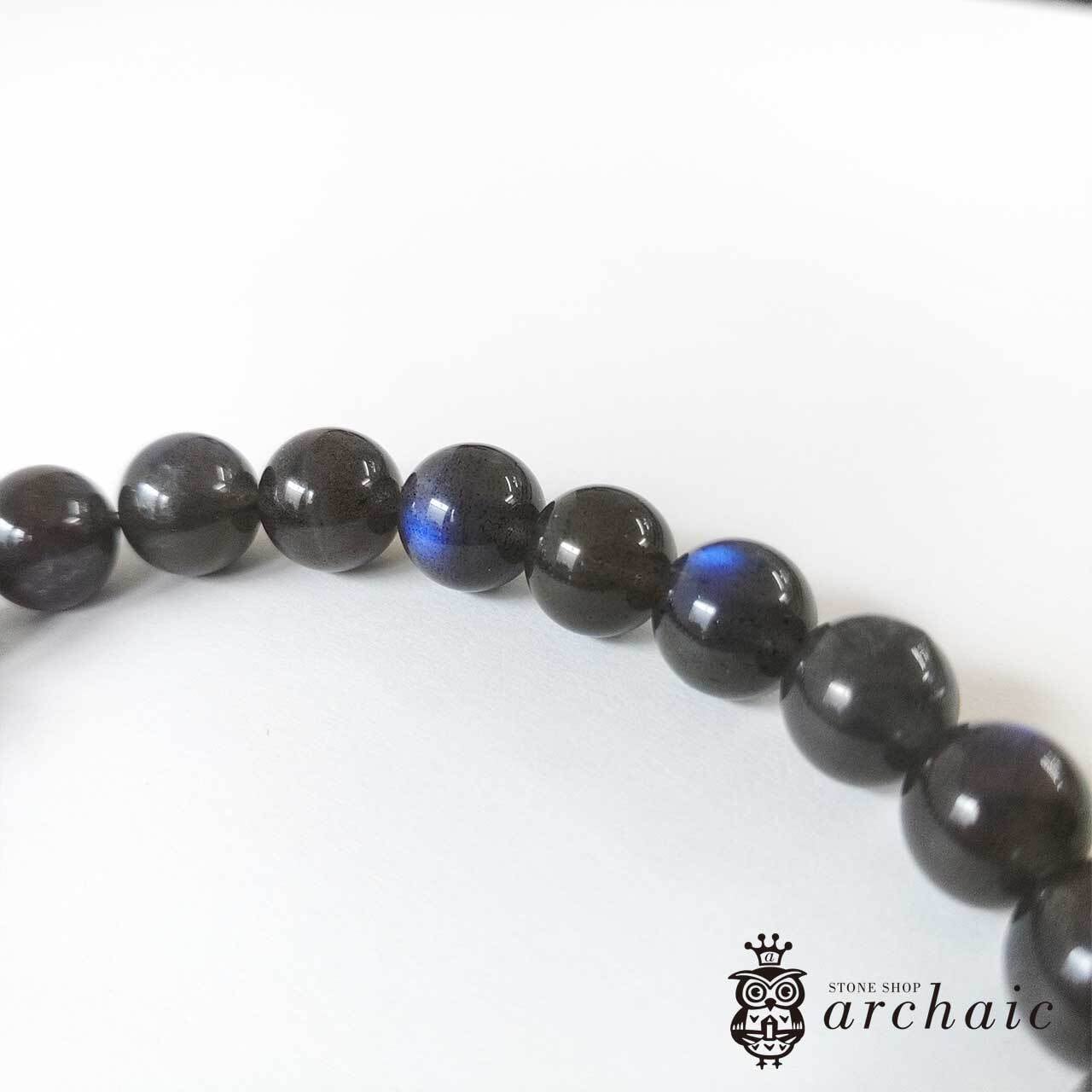 珍しい、地色が黒×青一色のラブラドライトレッセンスが美しいブラックラブラドライトの一連ブレスです。