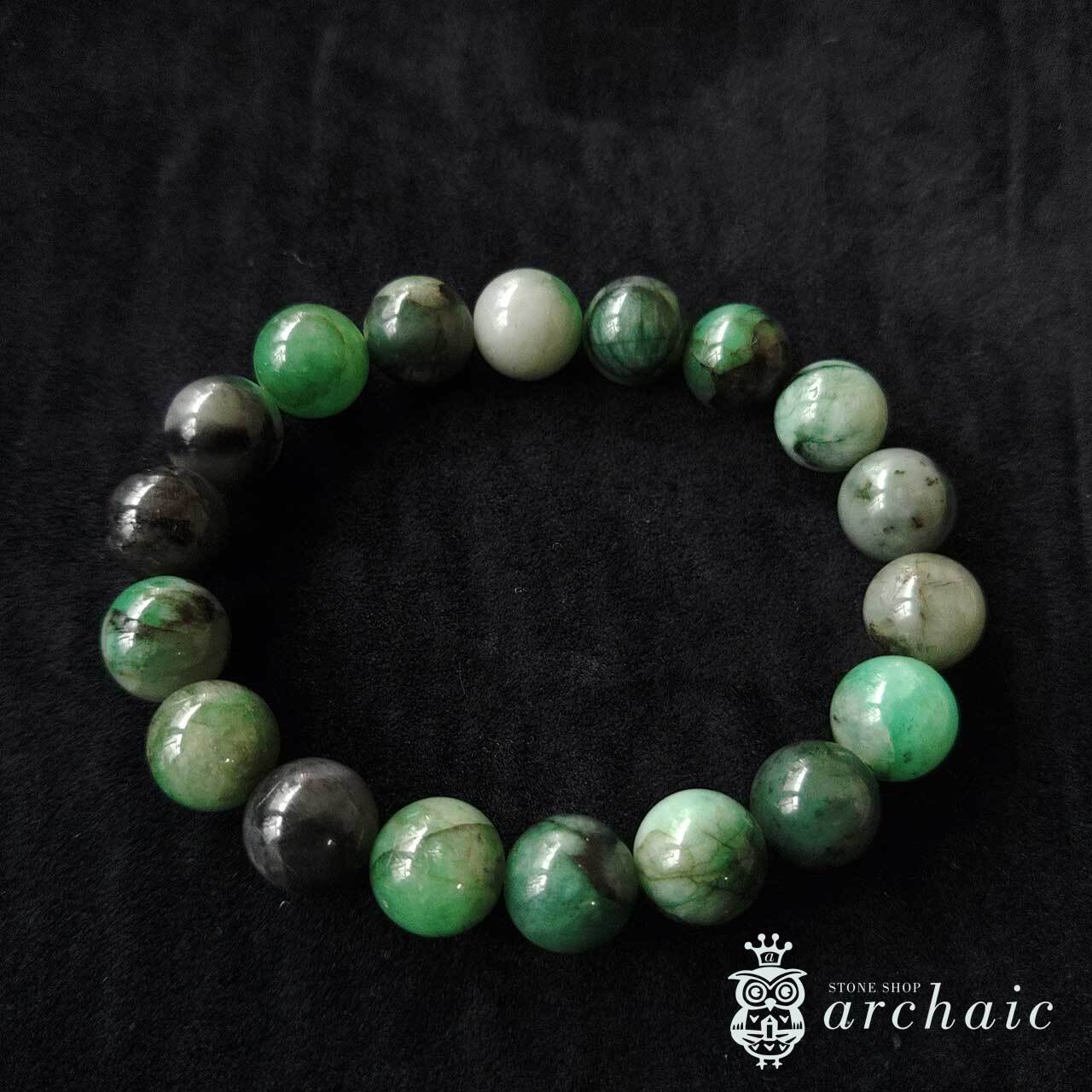 宝石とは見た目もきらめきも透明度も違いますが、濃い緑と黒の組み合わせが凛々しい、天然石ならではの表情豊かなブレスレットです。