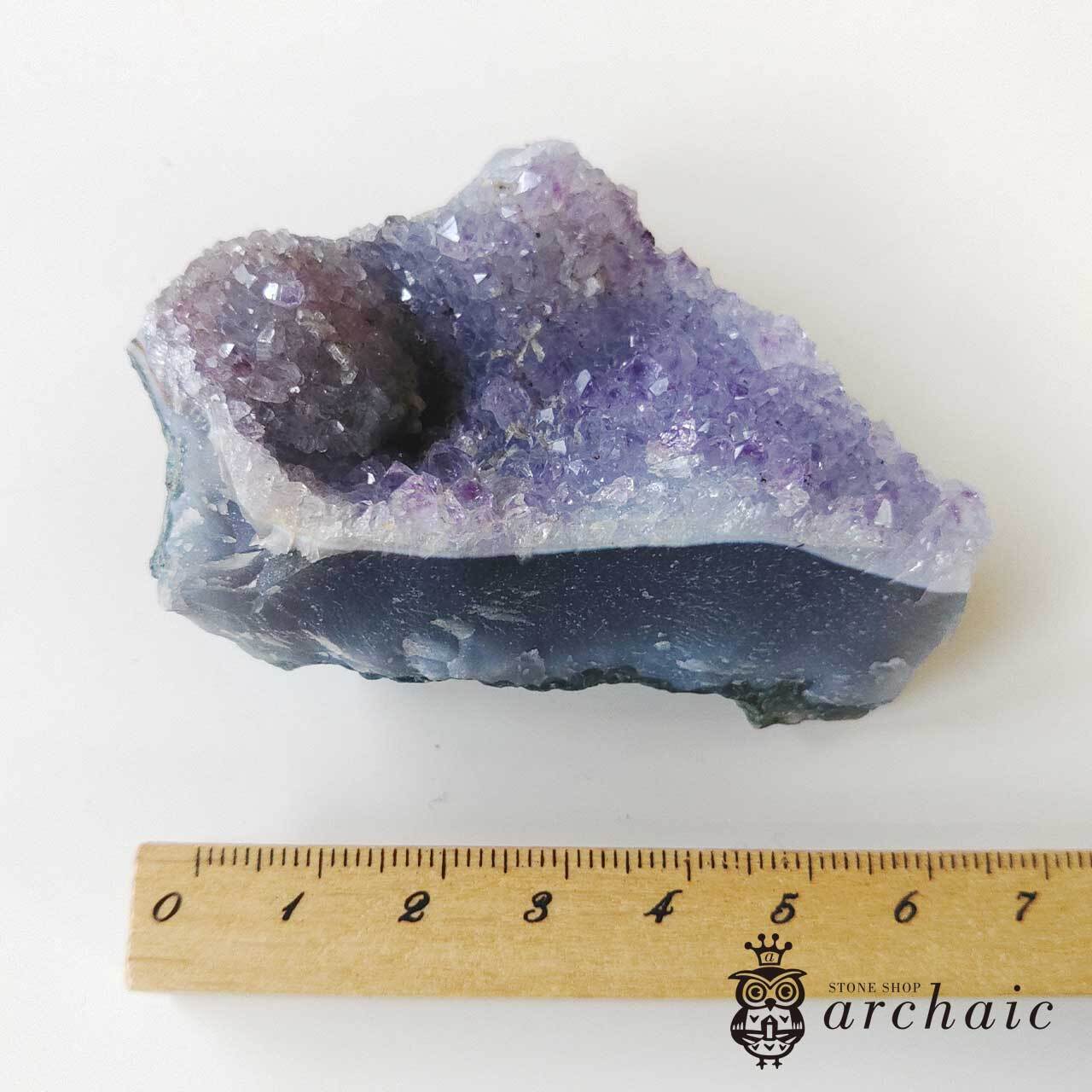 きらめく紫色の細かな結晶と、メノウ化した母岩のブルーグレーが美しいアメジストのクラスターです。