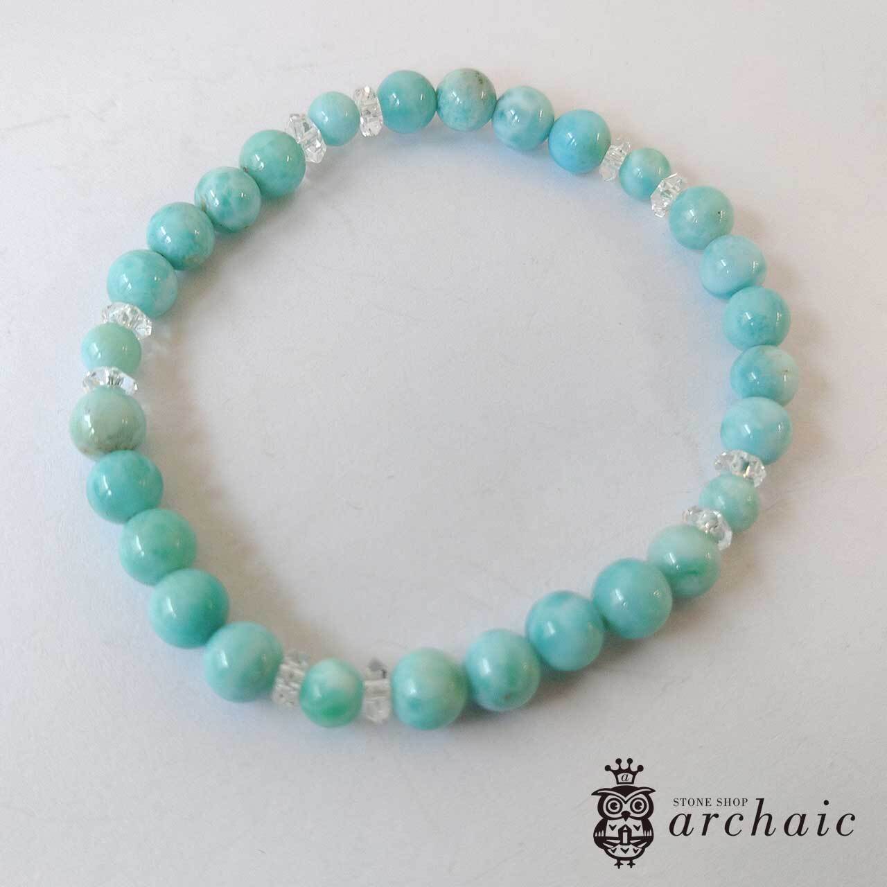 小粒ながら上質なラリマーの丸玉に水晶を組み合わせた細身のブレスレット。